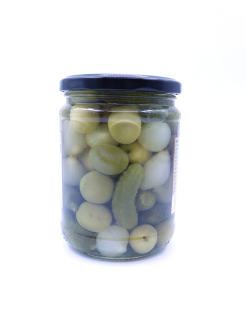 Целые зеленые оливки, корнишоны, маленький лук, вода, соль, уксус, Е621, Е520, Е300, Е223, Е270 / Энергетическая ценность: 297 кДж/70 ккал. Жиры 6,4 г. из которых насыщенные 2,4 г., углеводы 0,2 г. в том числе сахар 0 г., протеин 1,2 г., соль 3 г.