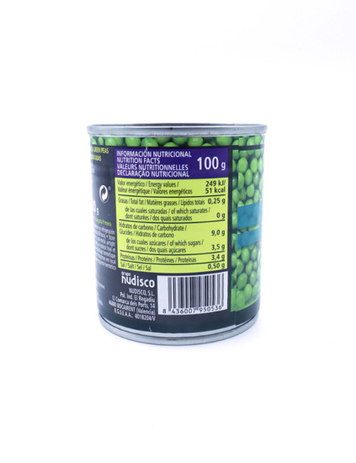 Зеленый горошек, вода, соль / Энергетическая ценность: 249 кДж/51 ккал. Жиры 0,25 г. из них насыщенные 0,0 г., углеводы 9 г,. сахар 3,5 г., белки 3,4 г., соль 0,50 г.